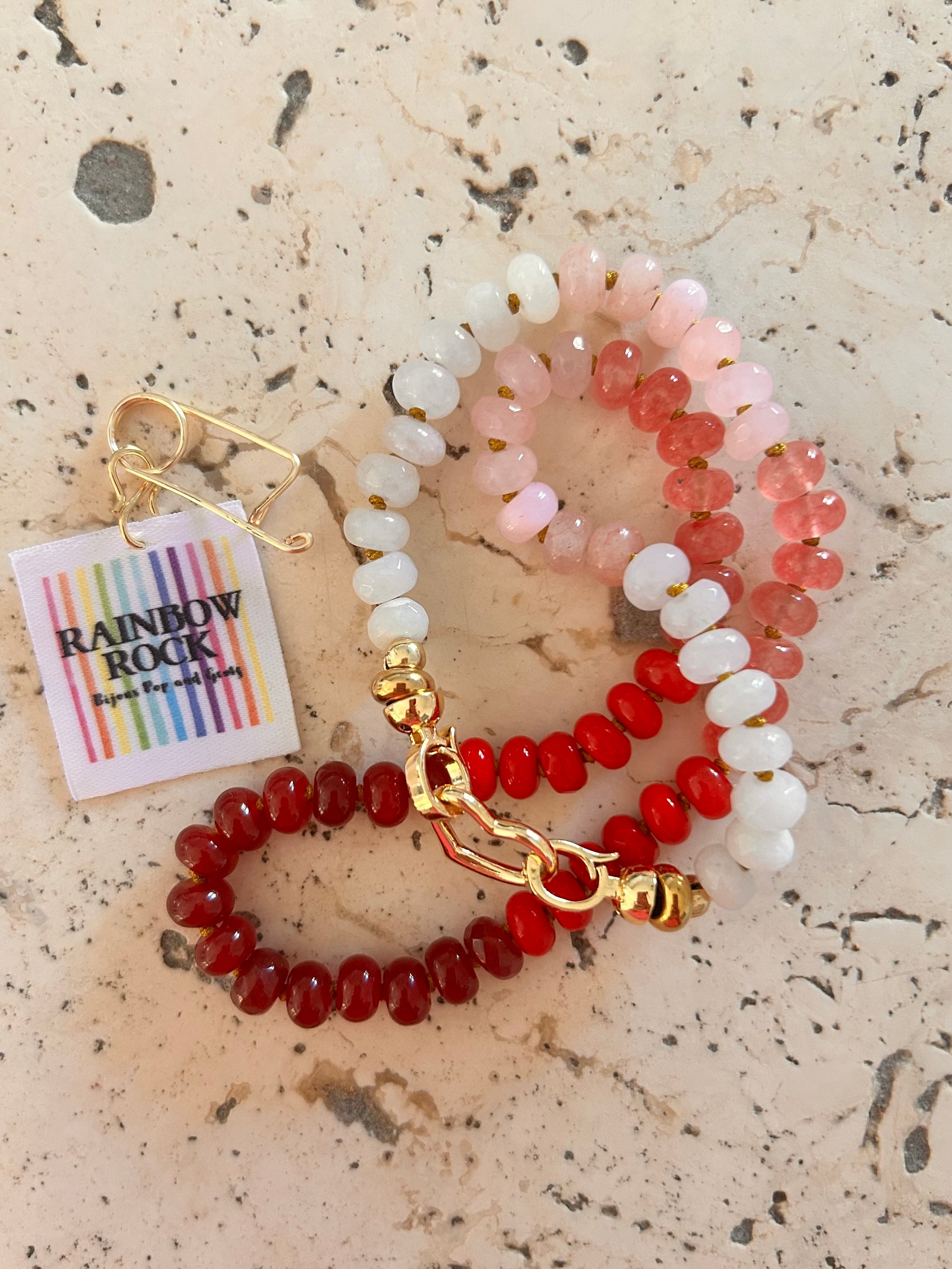 – Perles en pierres naturelles facettées : agate cerise, jade blanc, quartz rose, agate teintée