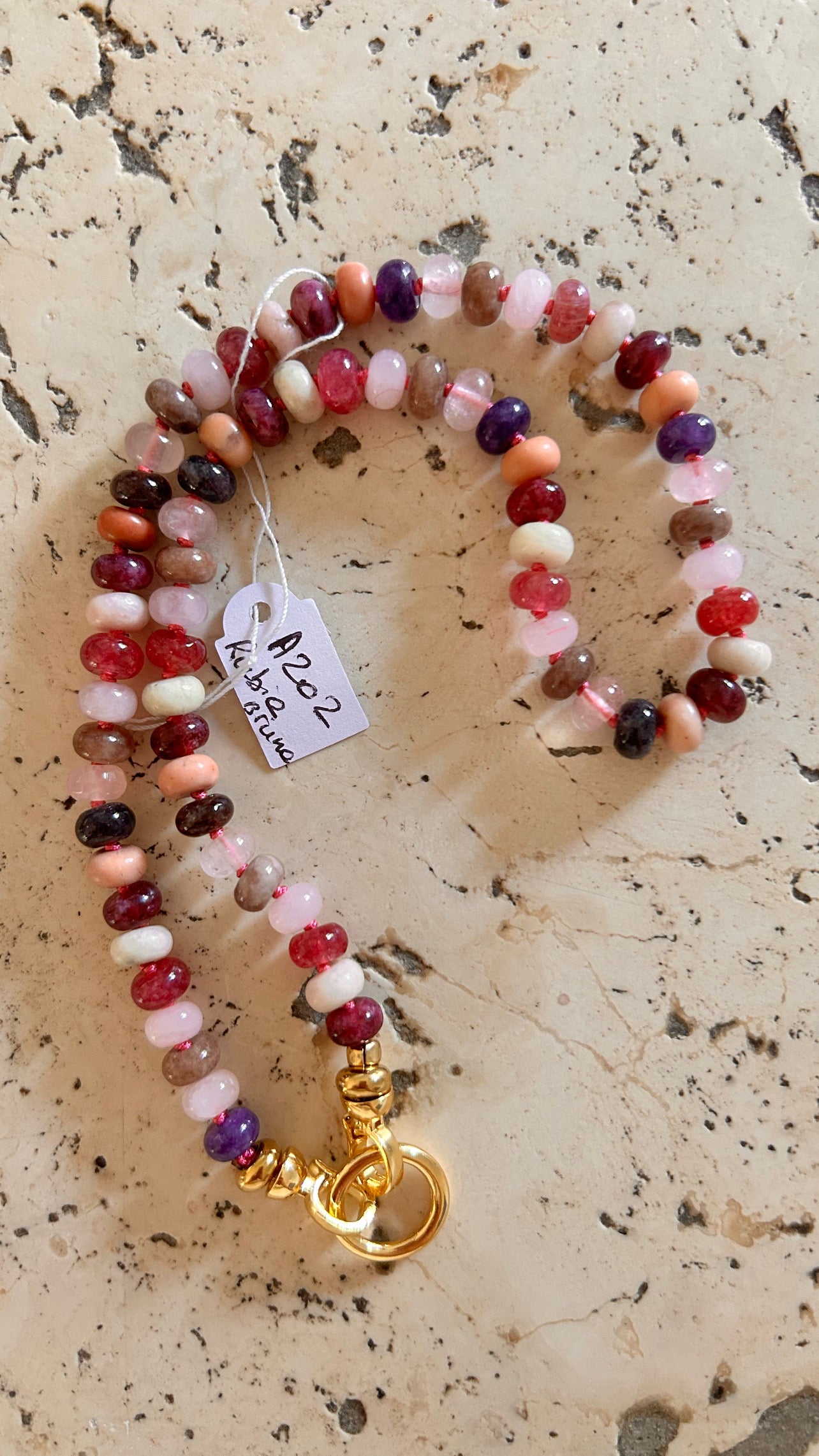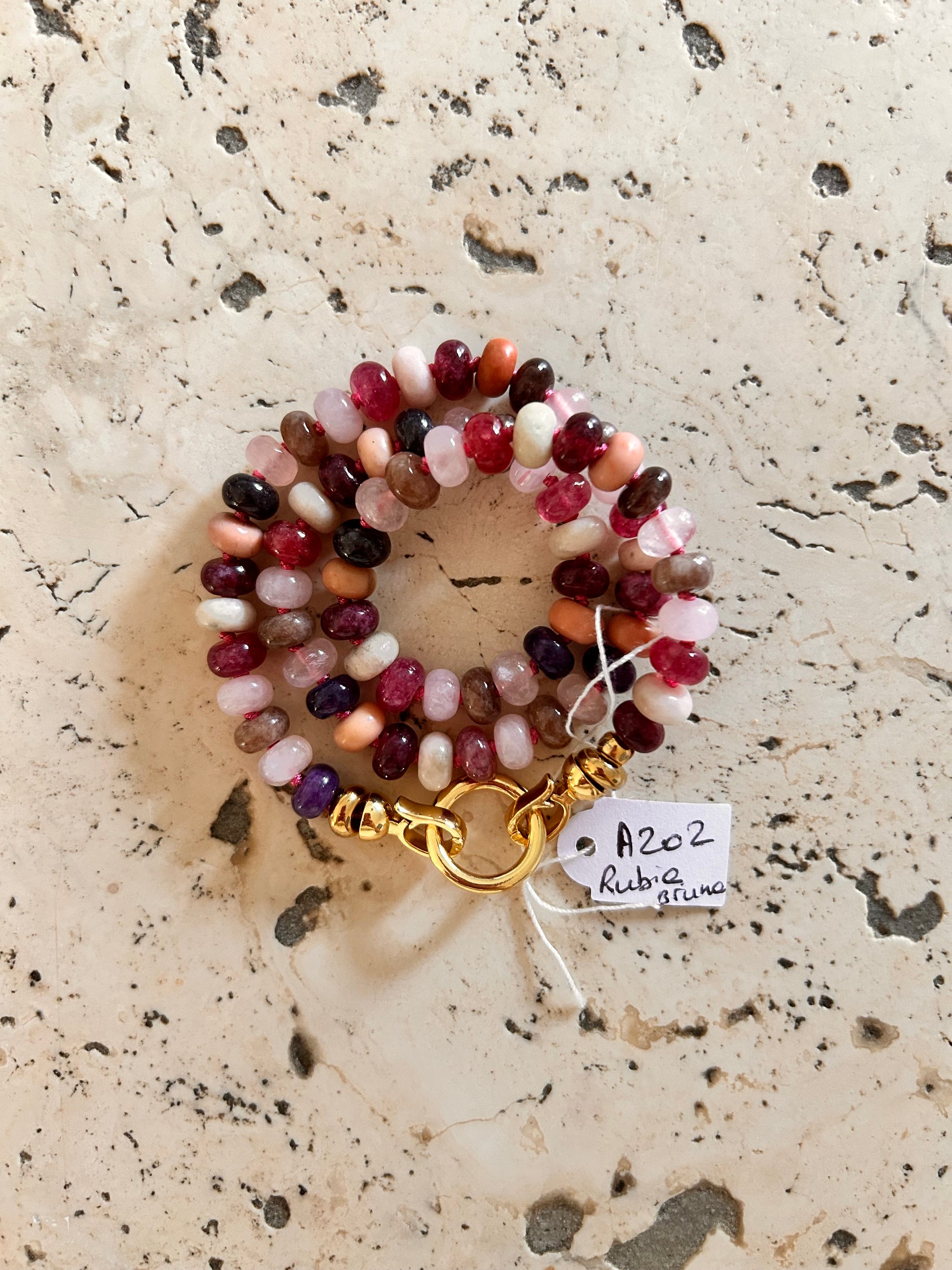 Le collier Rubia Bruna relie la douceur du cœur à la puissance de l’ancrage. Le bordeaux symbolise la passion, le rose ouvre aux émotions tendres et les tons bruns rappellent la stabilité de la terre. Un talisman de force tranquille et d’amour enraciné.