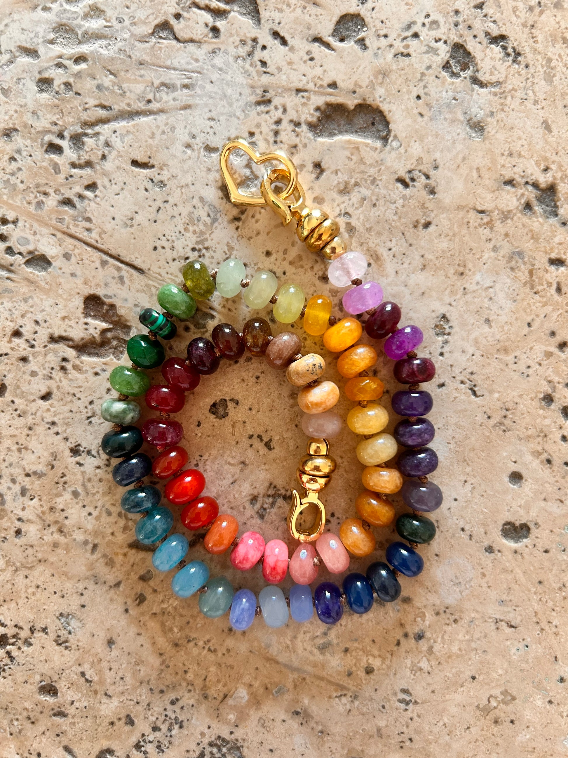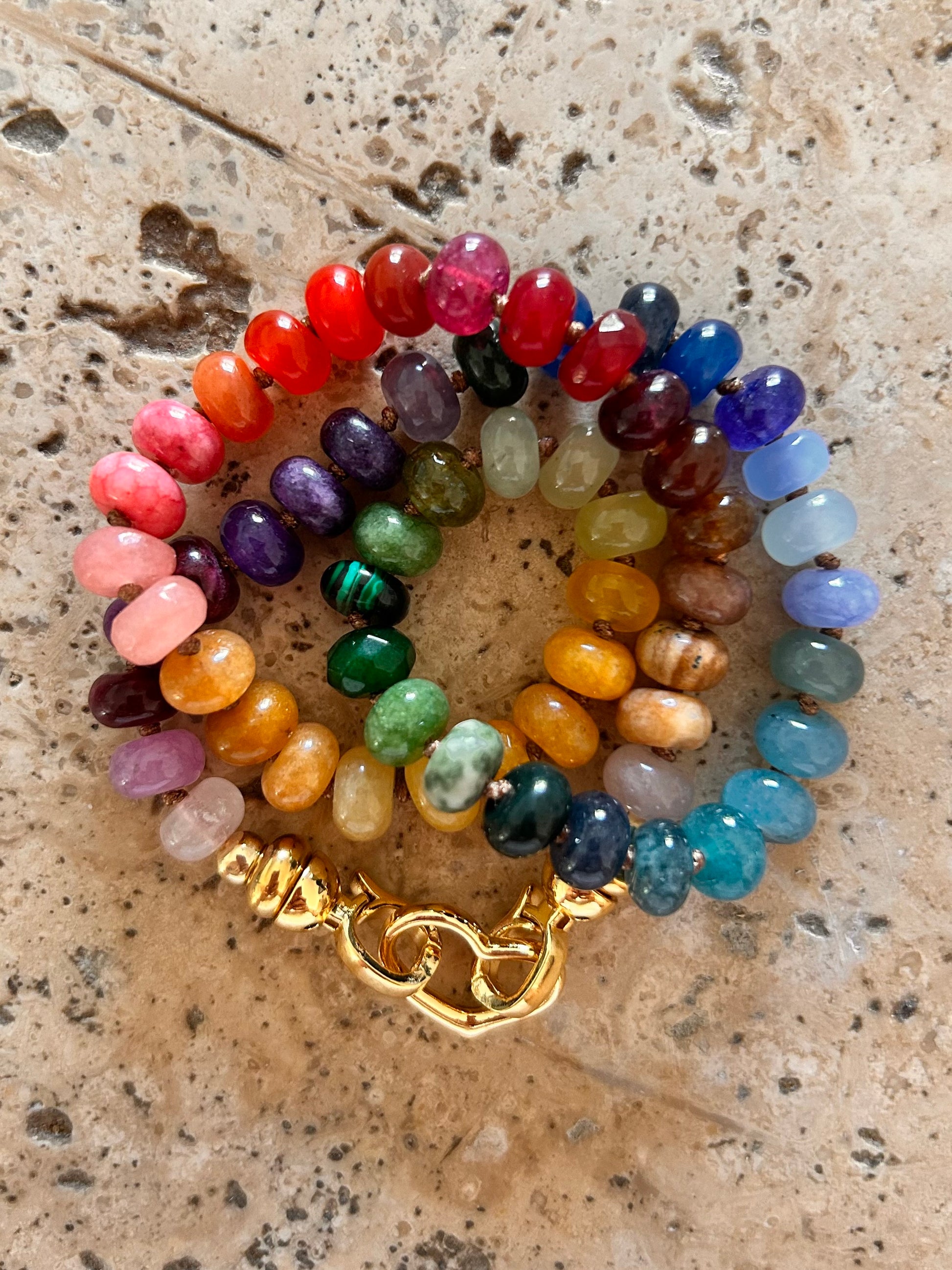 Composé de perles facettées de pierres naturelles, disposées en dégradé parfait, il incarne la joie, l’énergie et l’harmonie des couleurs. Son fermoir doré apporte une touche élégante et moderne qui met en valeur la palette multicolore.