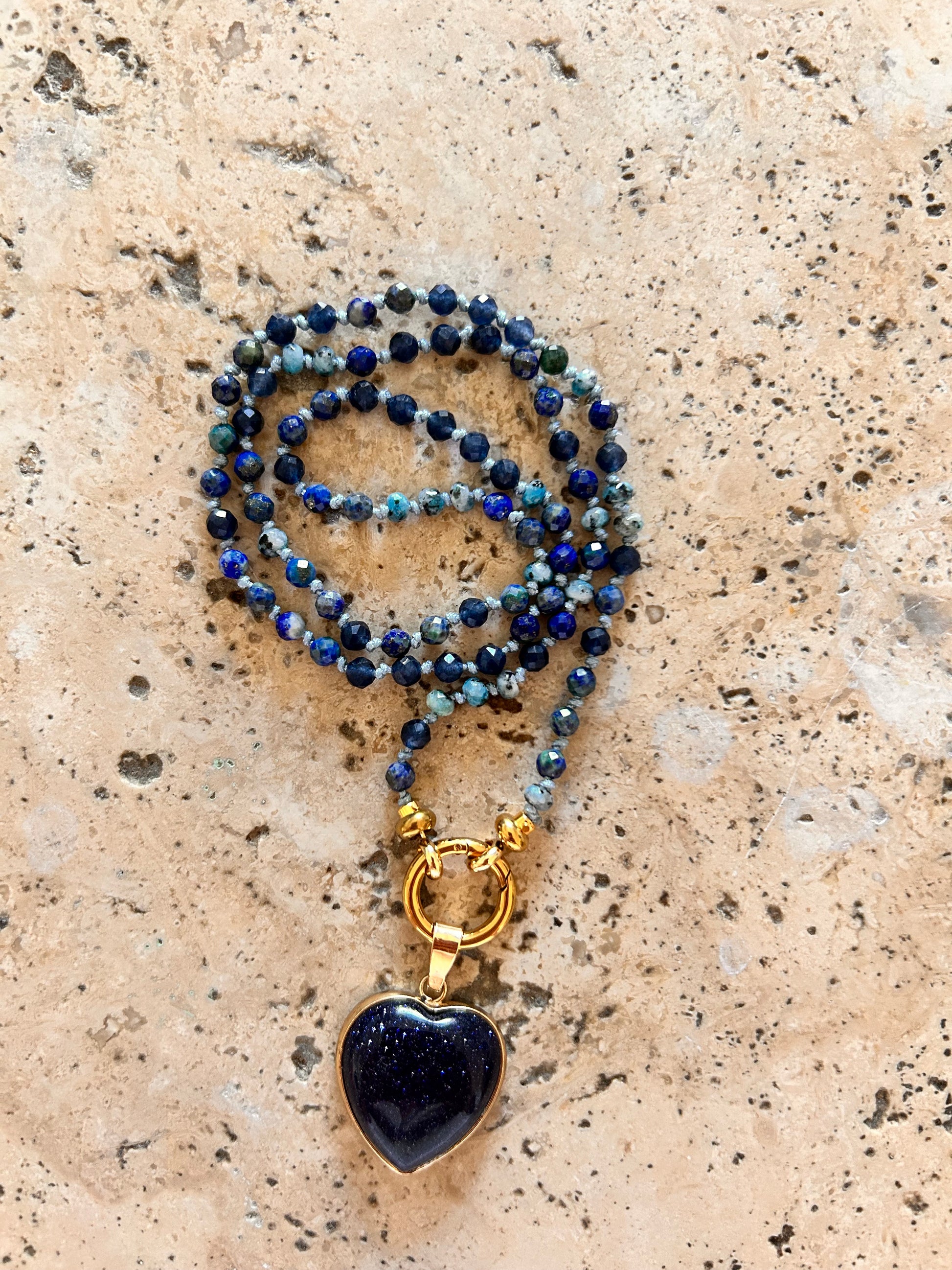 Ses perles facettées aux nuances de bleu roi et de bleu nuit sont nouées une à une avec soin, et s’illuminent d’un pendentif cœur scintillant. Le fermoir en acier inoxydable vient sublimer l’ensemble d’une touche précieuse et intemporelle.