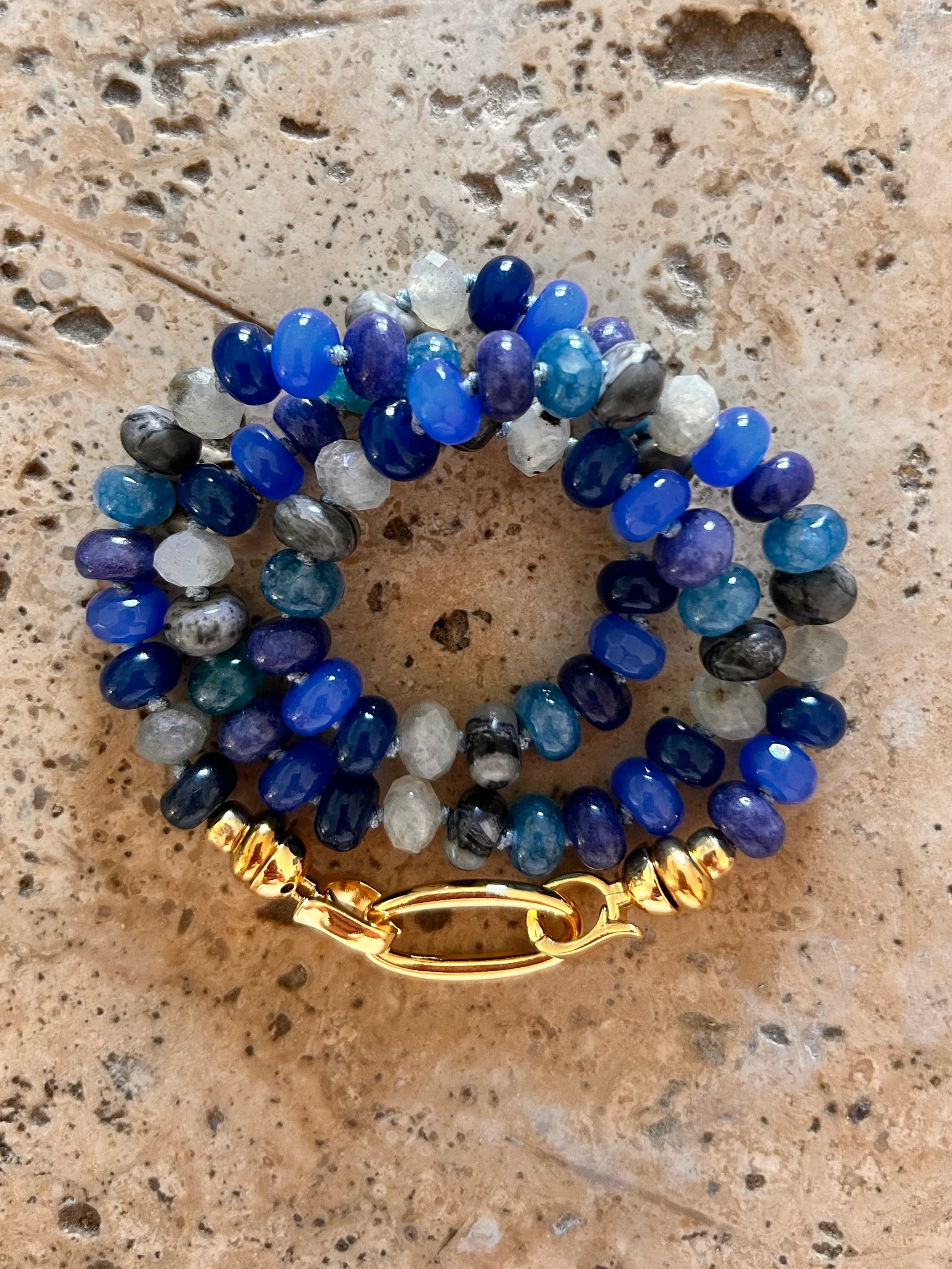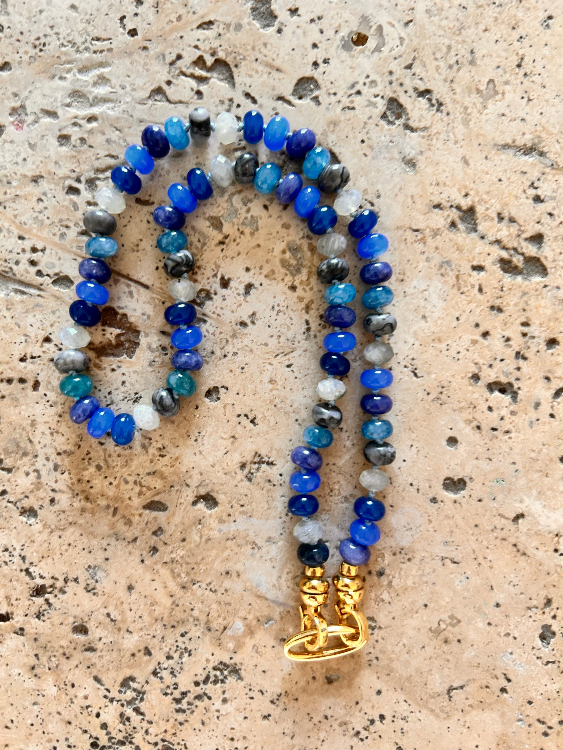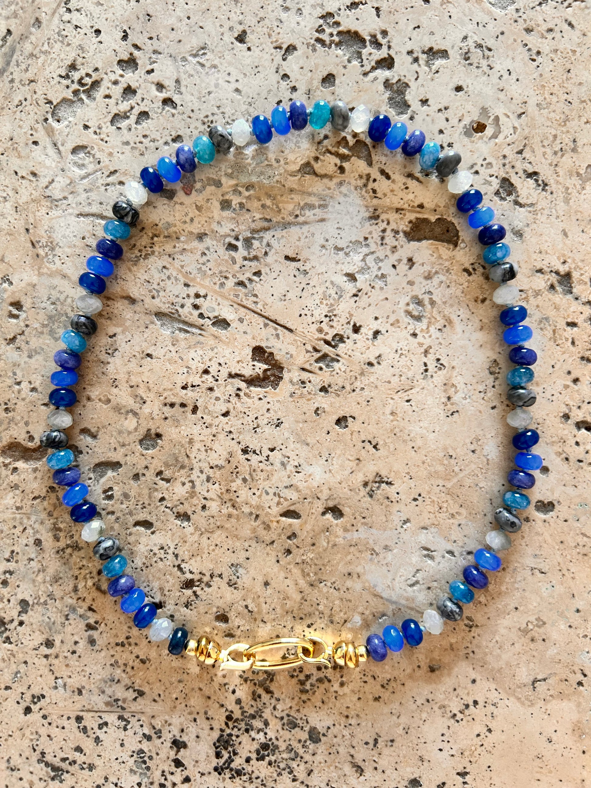 - Perles lisses et facettées en nuances de bleu, gris et turquoise (pierre naturelle mixte : sodalite, agate teintée, quartz et jades variés)