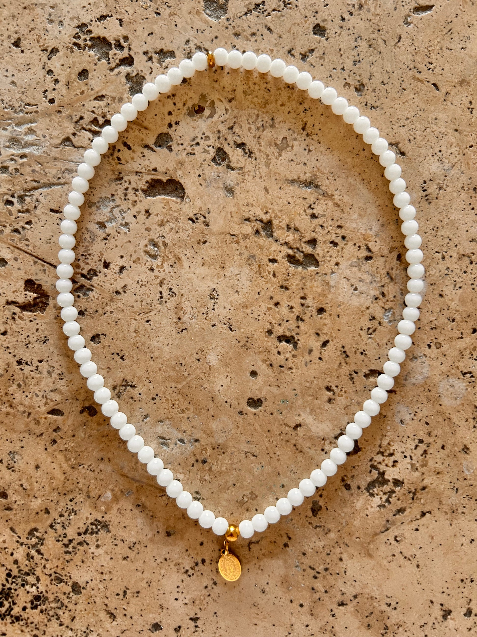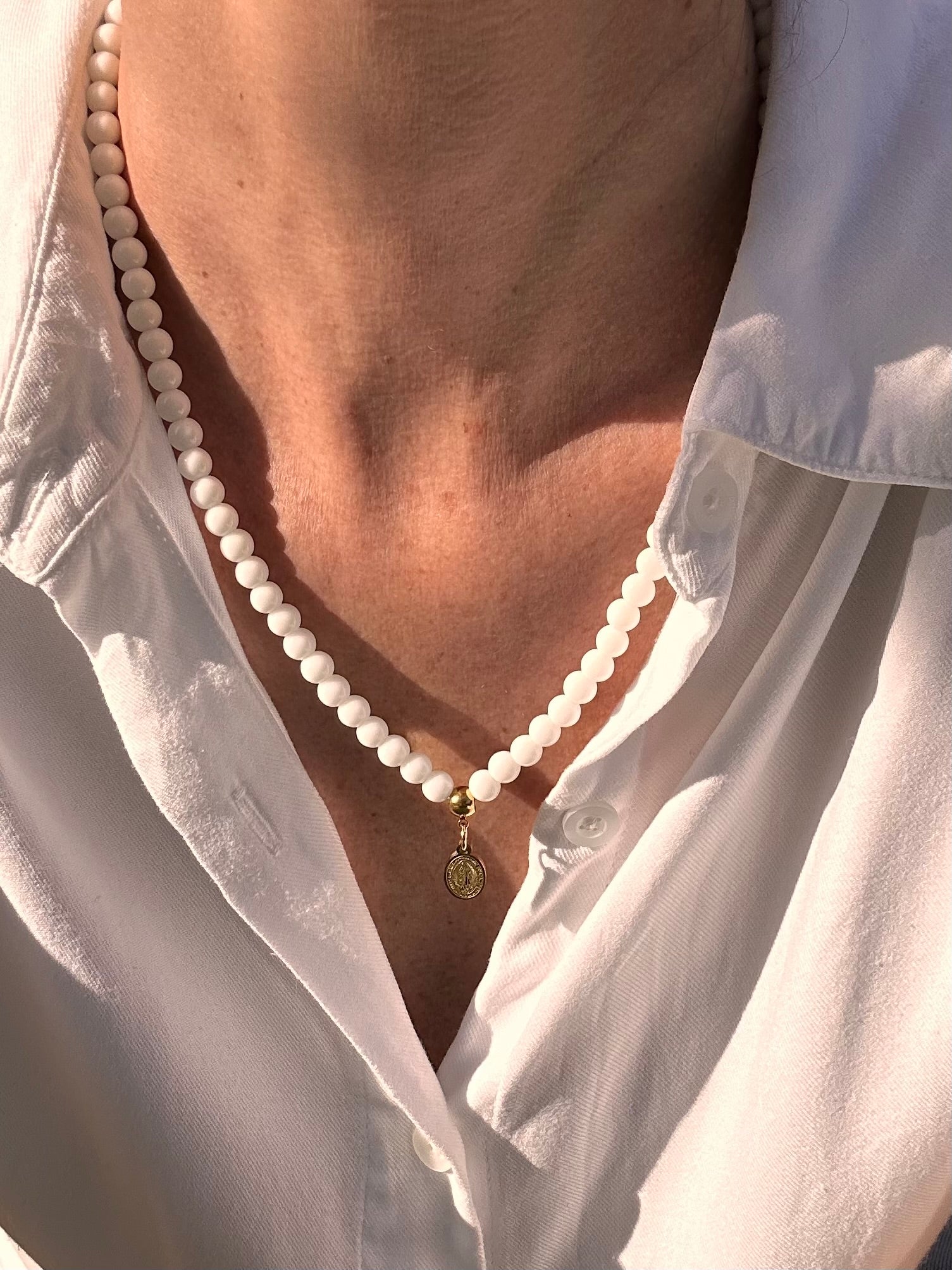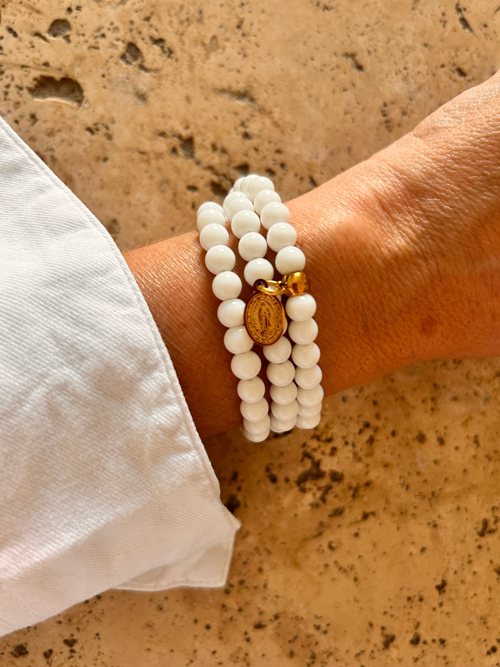 Bijou de lumière et de foi, Guadalupe est une pièce qui se porte aussi bien près du cœur qu’autour du poignet. En collier sobre et élégant ou en bracelet triple tours, il devient un talisman qui accompagne vos gestes et vos journées. L’agate blanche diffuse son éclat pur, tandis que la médaille dorée de Notre Dame de Guadeloupe apporte une note sacrée et intemporelle.