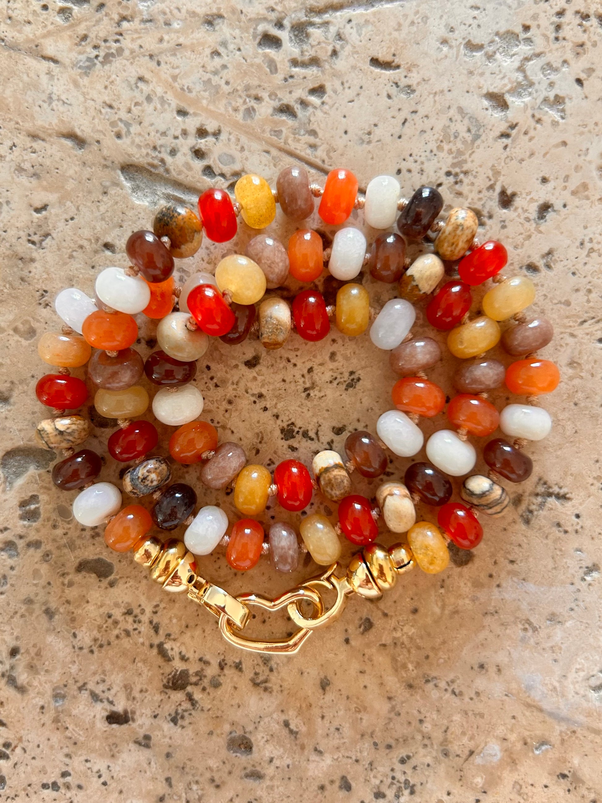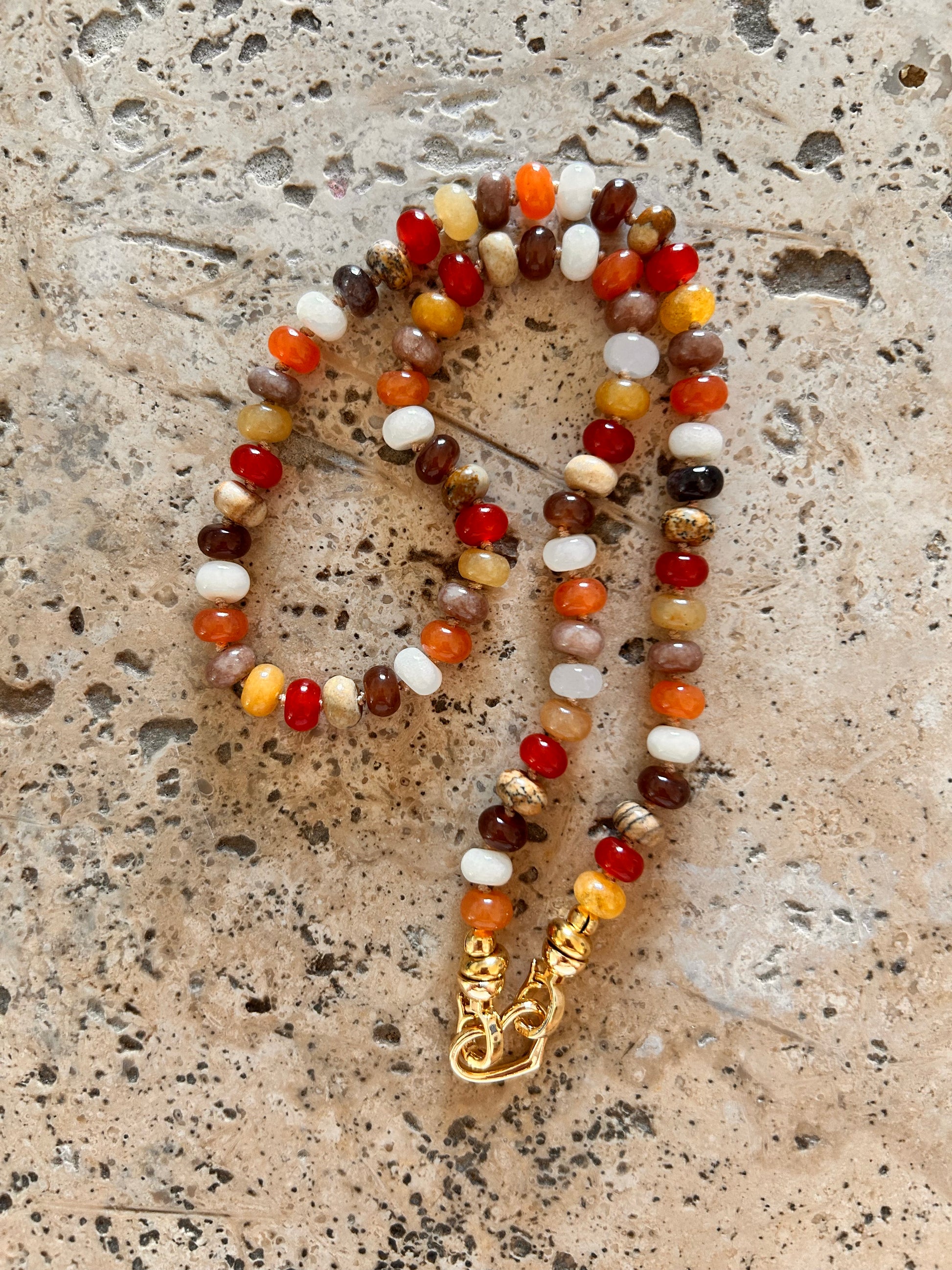 Soléa capture toute la richesse des couleurs de la terre et du feu : rouges profonds, orangés incandescents, ocres lumineux et bruns rassurants. Chaque perle semble chargée d’énergie, comme une étincelle de braise ou un éclat d’épices. Ce collier est une invitation à rayonner, à assumer sa force intérieure et sa joie de vivre.