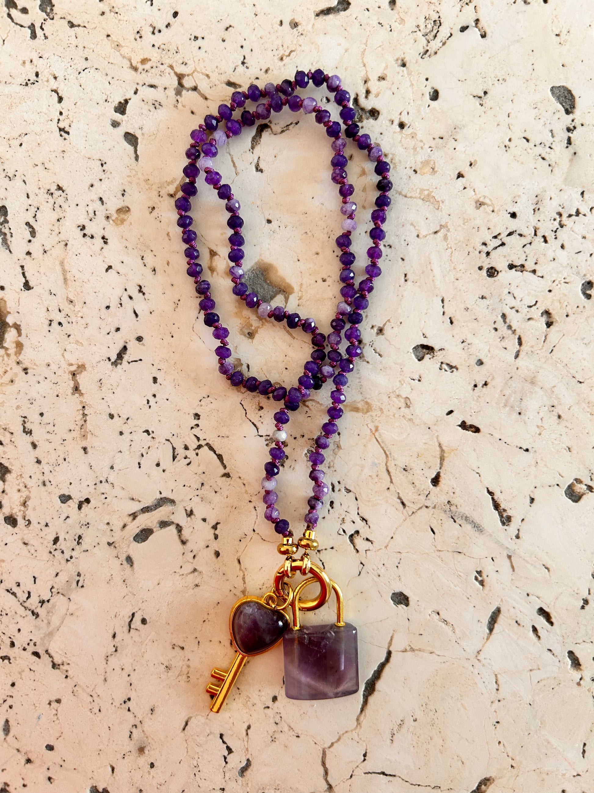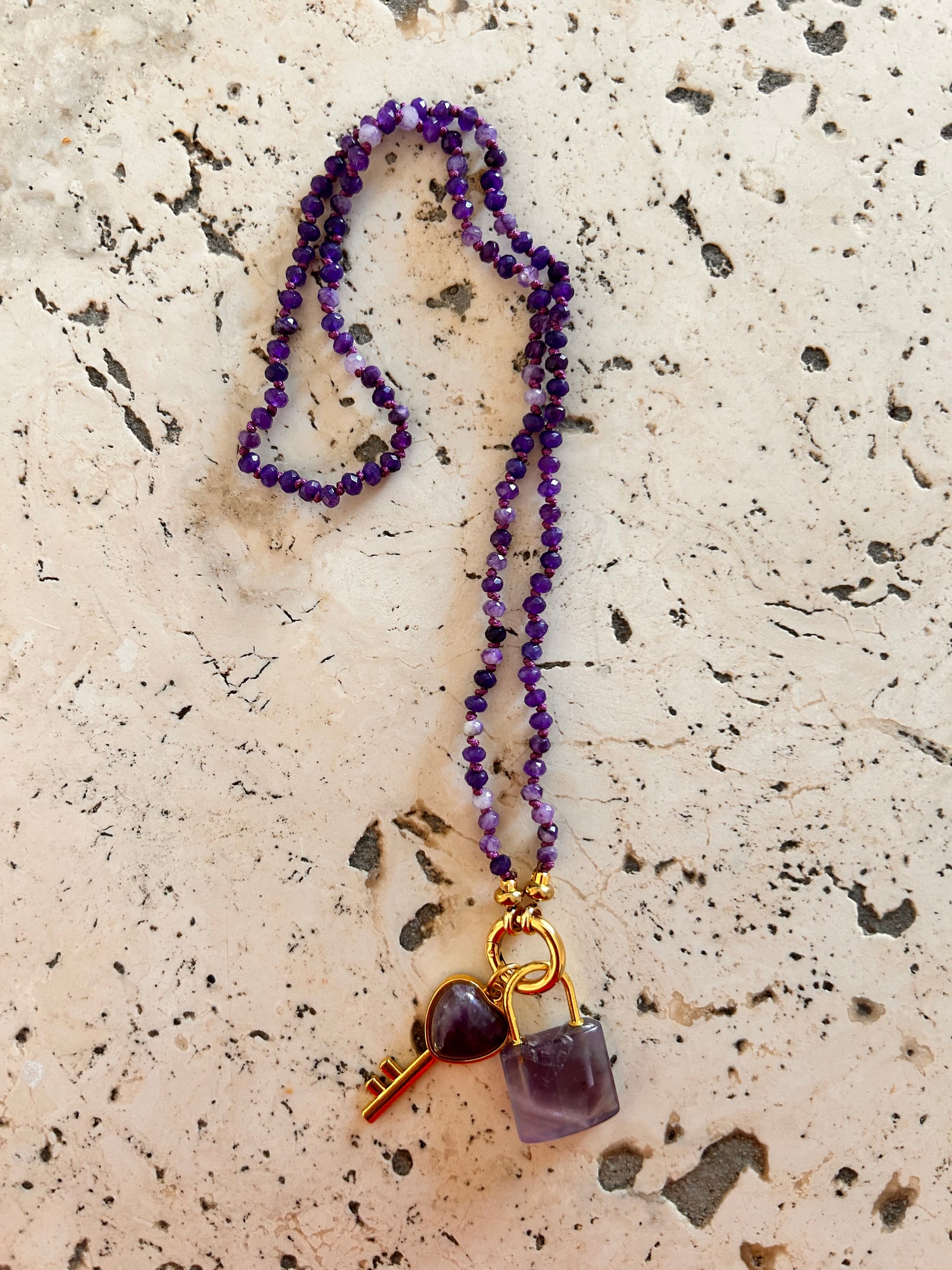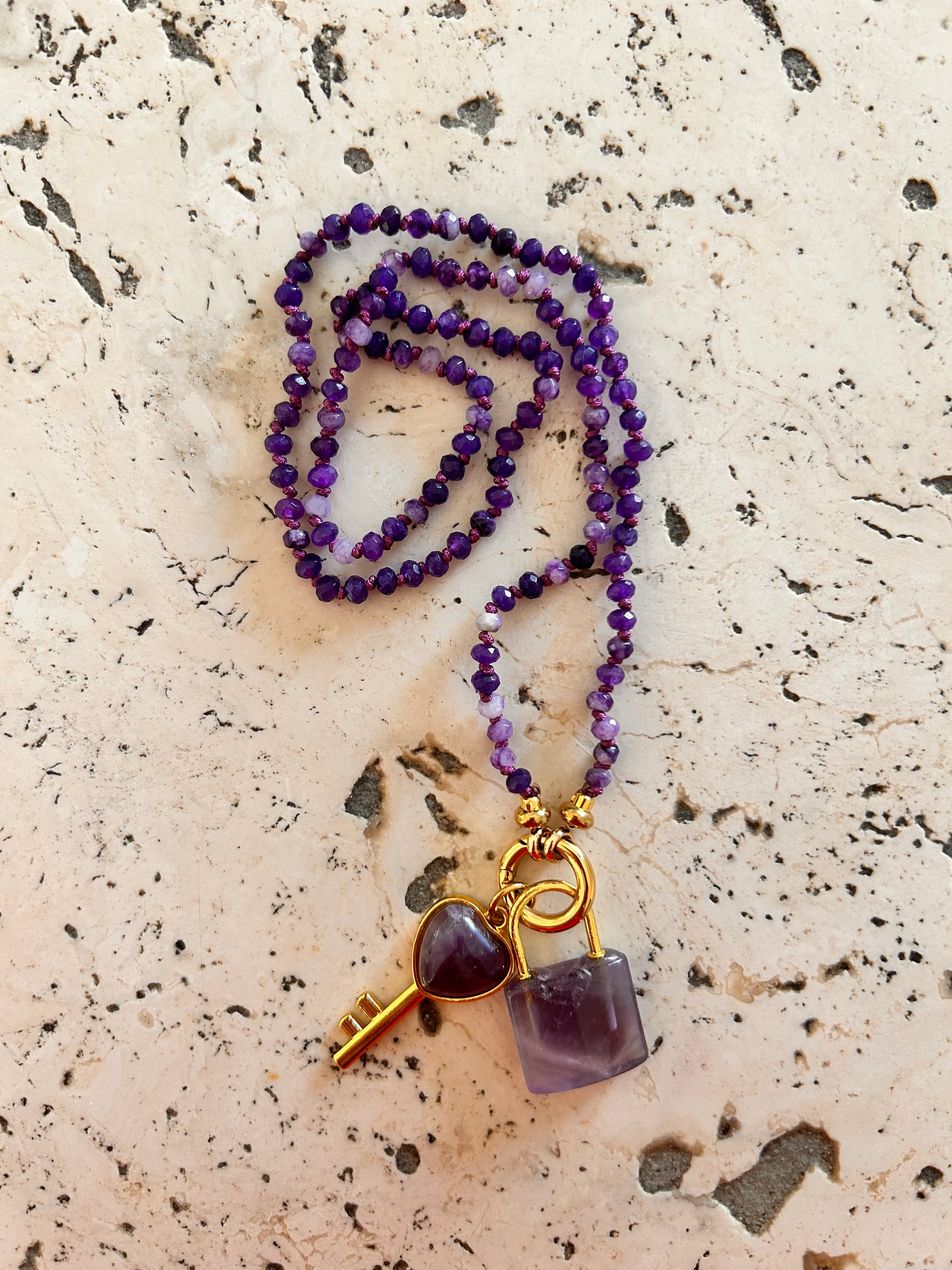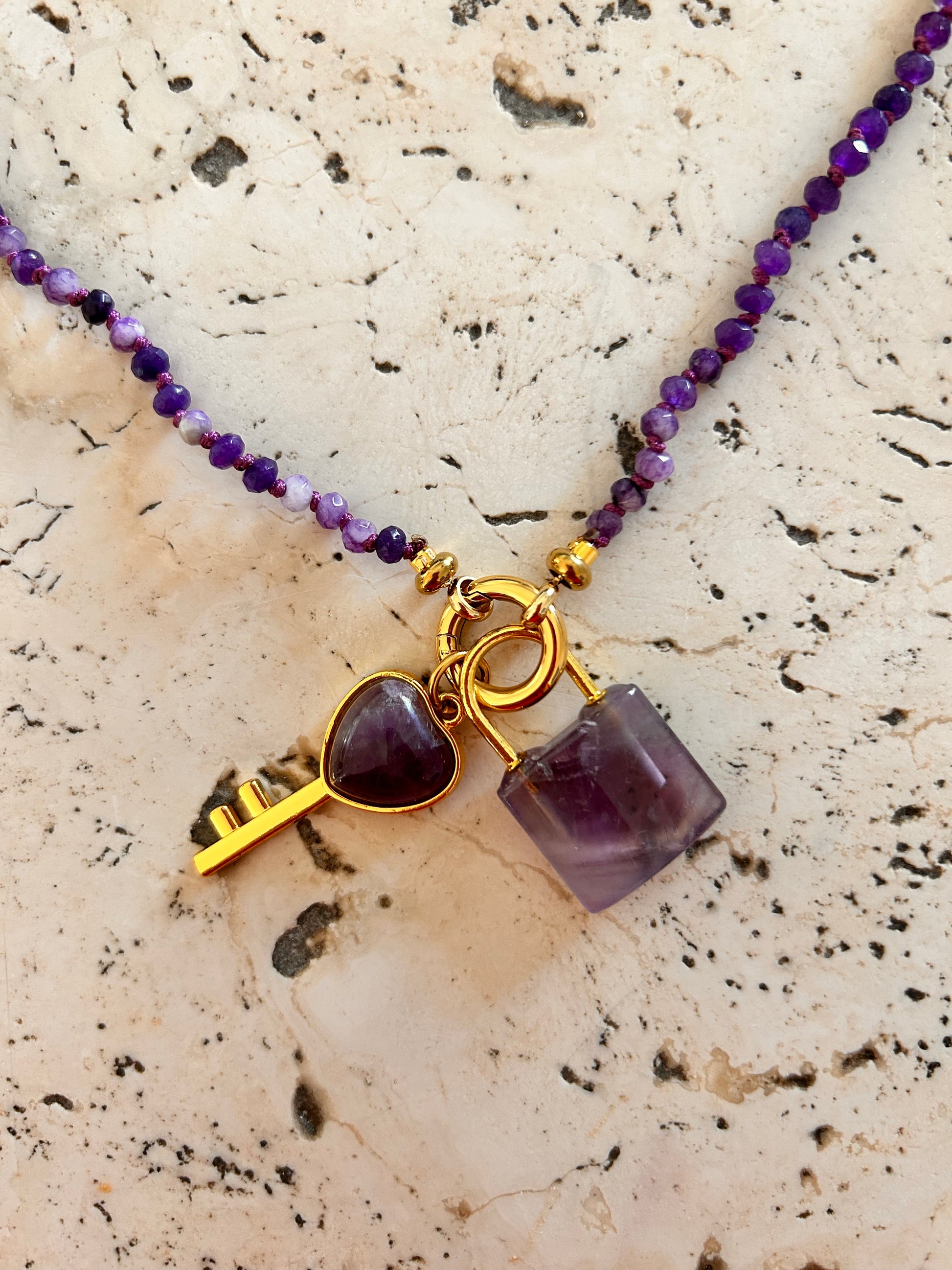 Collier Enigma – Améthyste & pendentif cadenas clé
