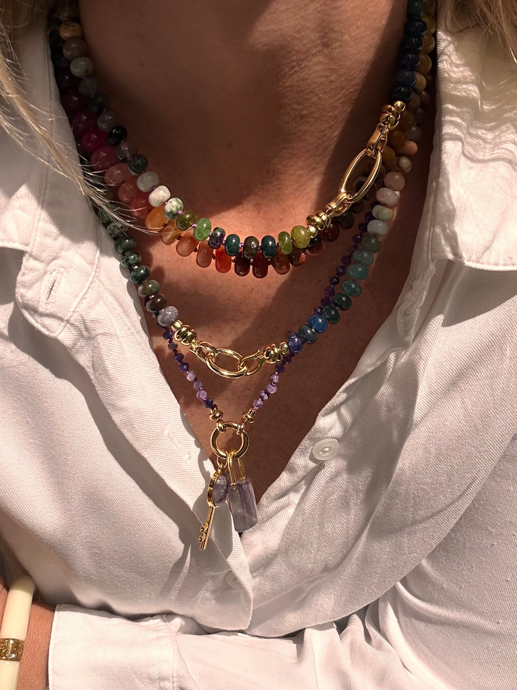 Au centre, un duo de pendentifs attire tous les regards : une clé en forme de cœur et un cadenas taillé dans l’améthyste. Comme une énigme à déchiffrer, ils incarnent à la fois le secret et la révélation, la fermeture et l’ouverture, la protection et l’amour.