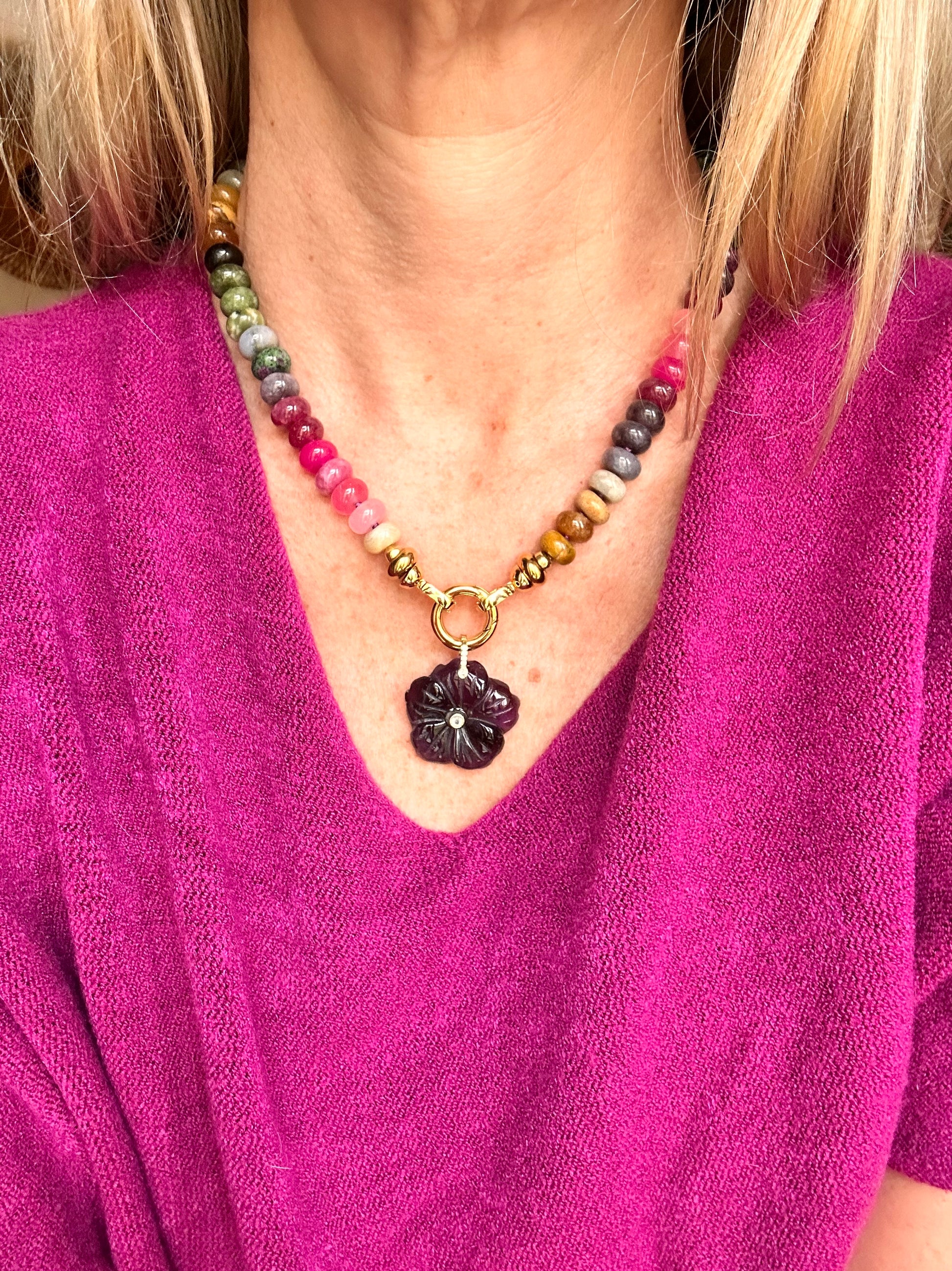 Mystérieux et vibrant, le collier Nerina capture la beauté brute des pierres de la terre mêlée à la douceur du crépuscule.