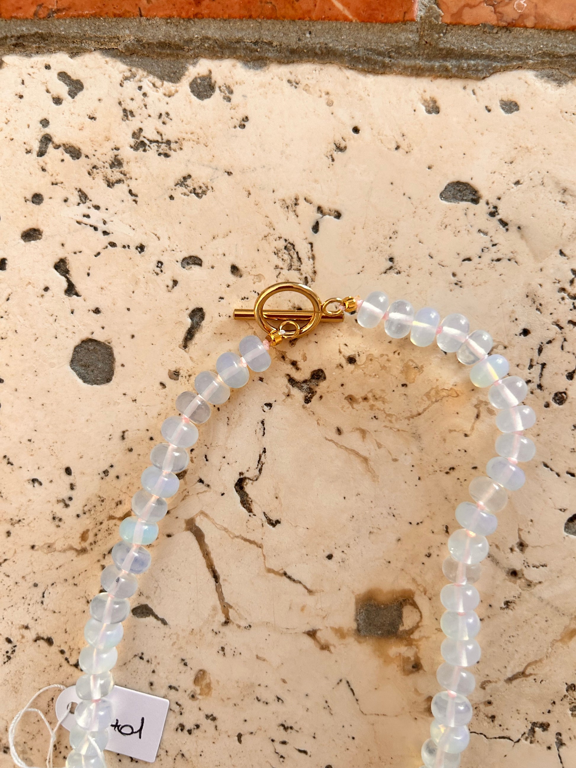 Son opalite irisée capte les reflets bleutés, rosés, laiteux… comme une goutte de lune posée au creux du cou.