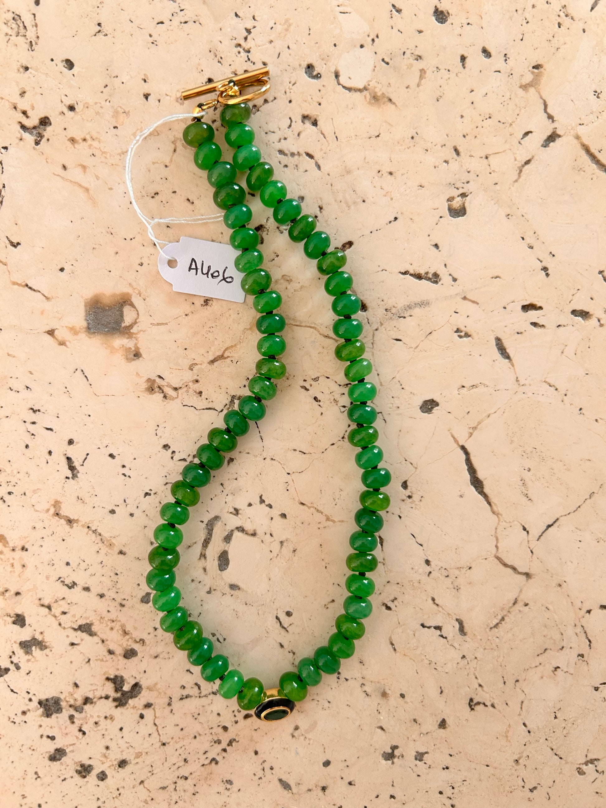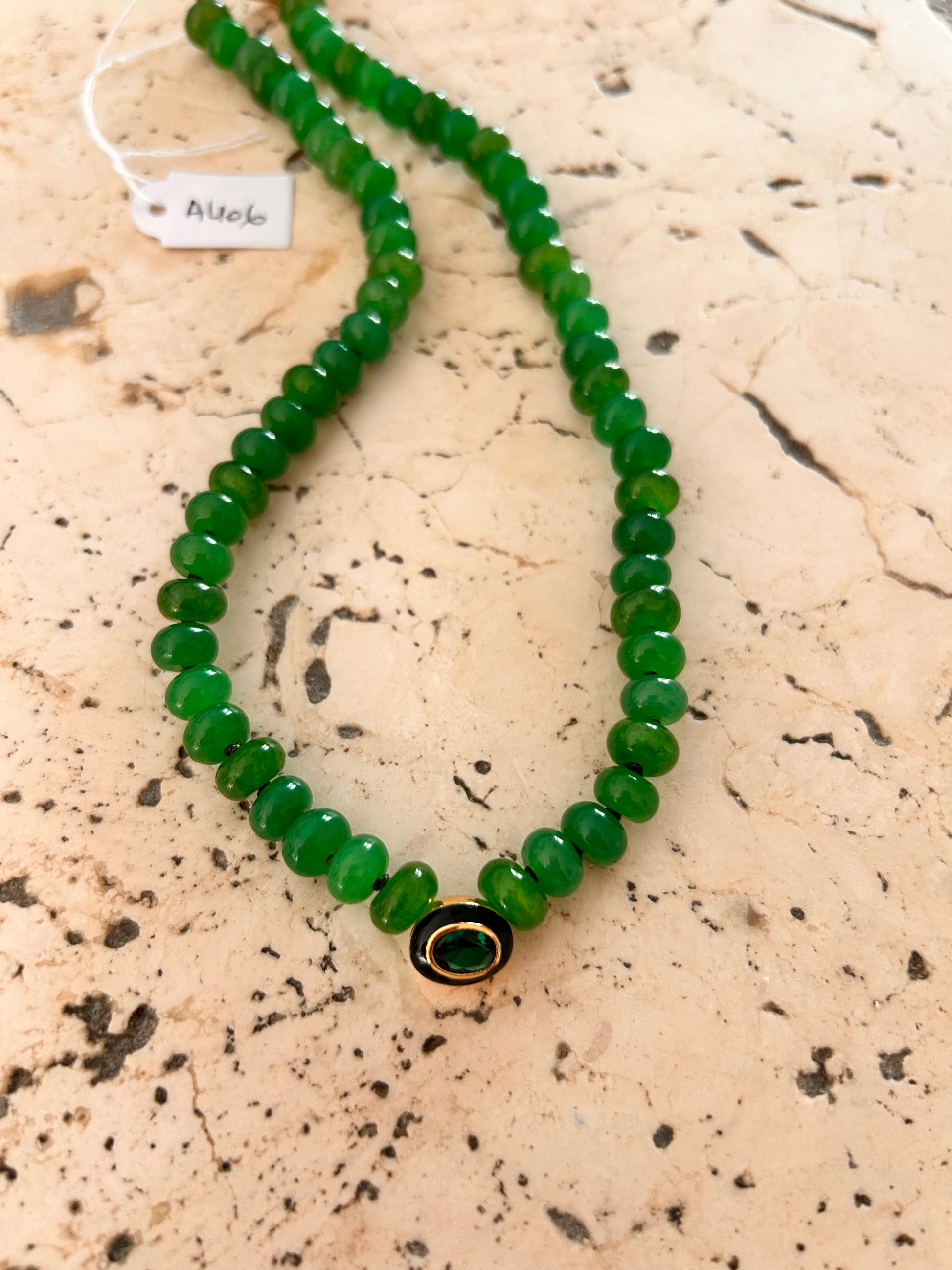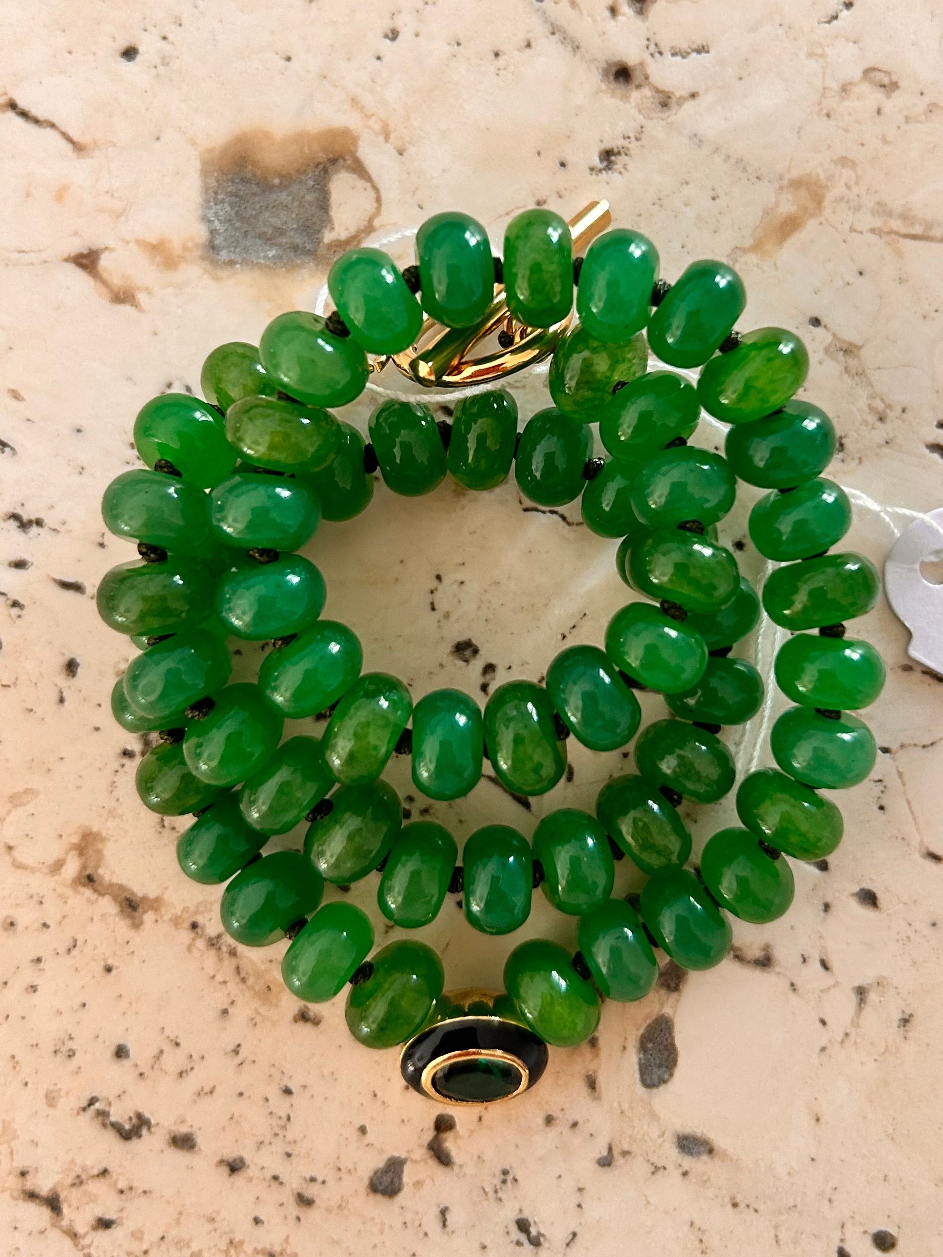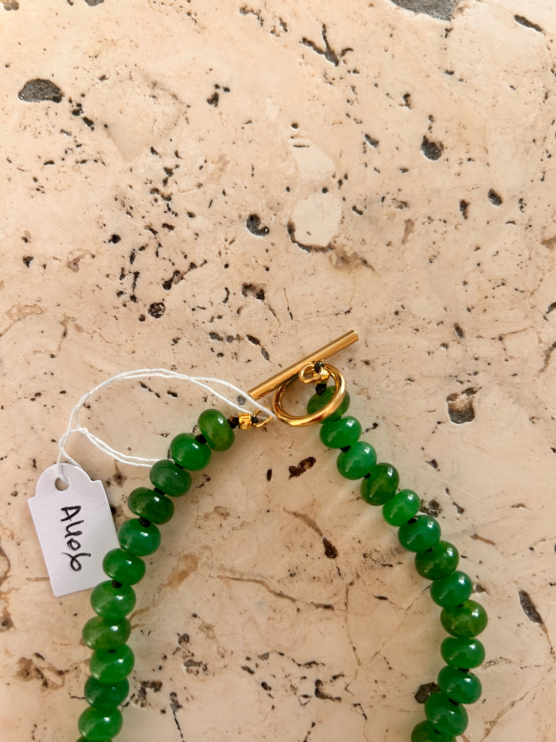 Porté court, tout près du cou, ce chocker en jade vert apporte une touche naturelle et joyeuse à n’importe quelle tenue.
