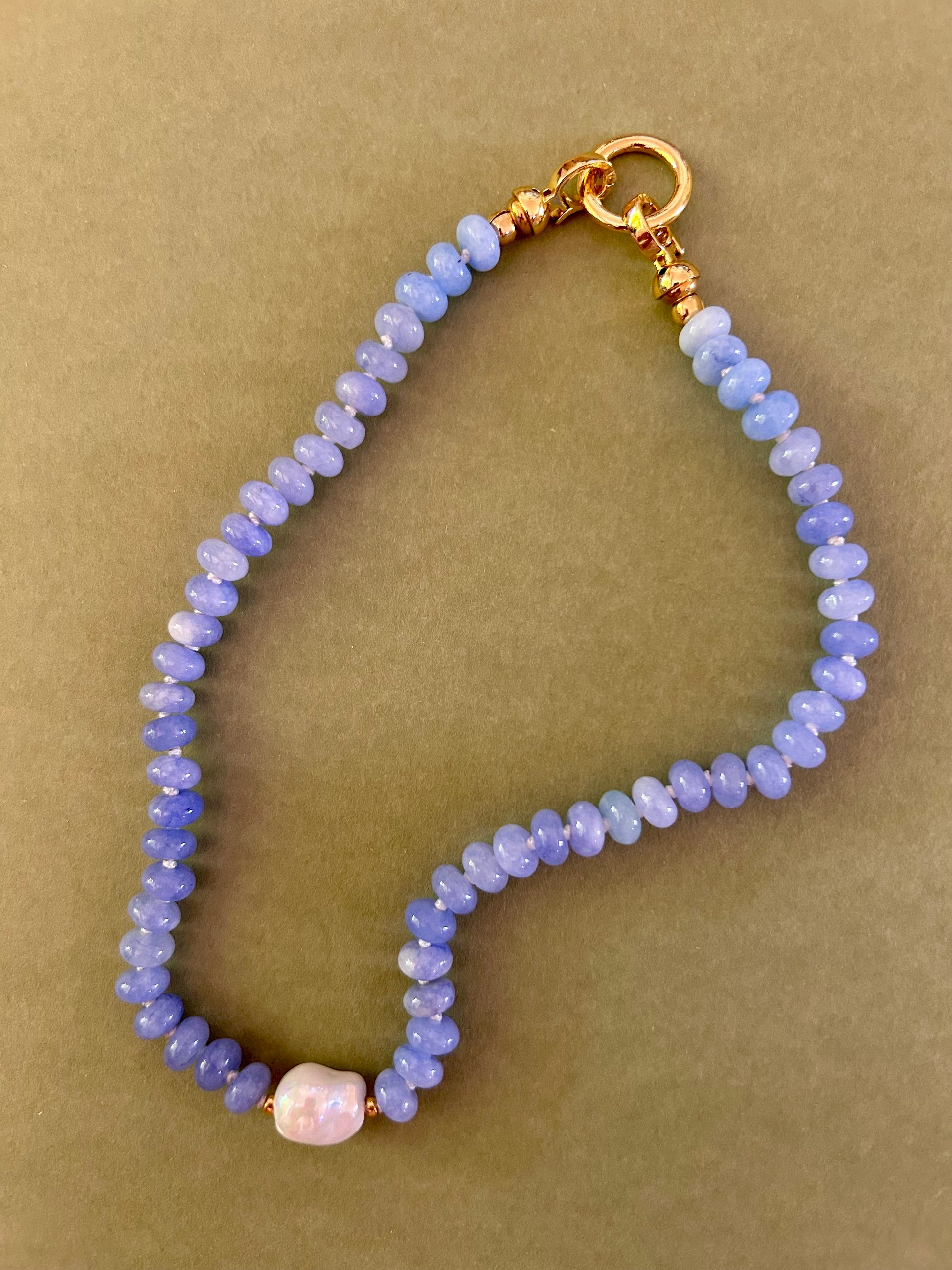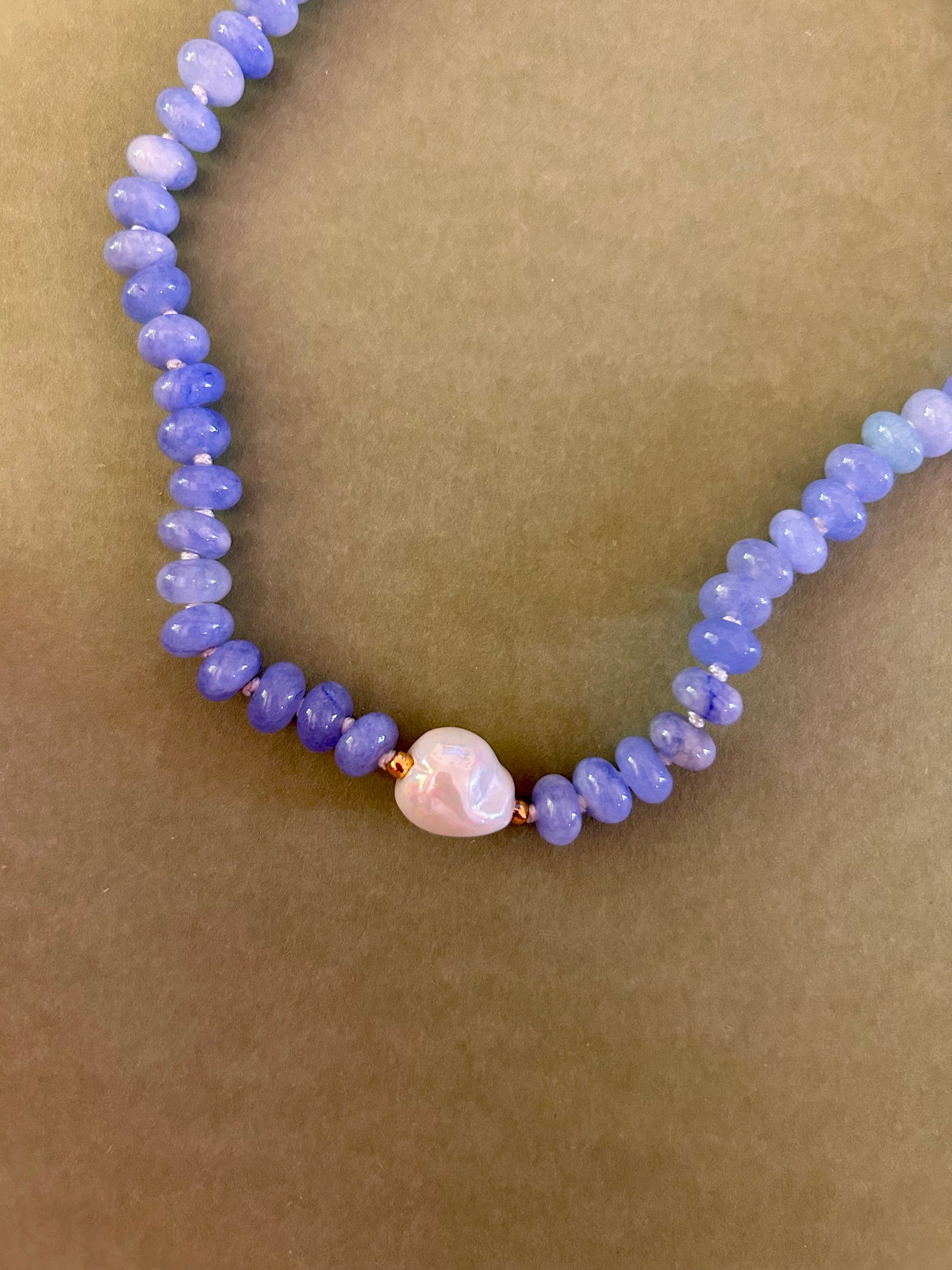 Un collier court, composé de perles rondelles aux reflets lavande, entre ciel et brume, qui encadrent une perle baroque centrale nacrée et lumineuse.