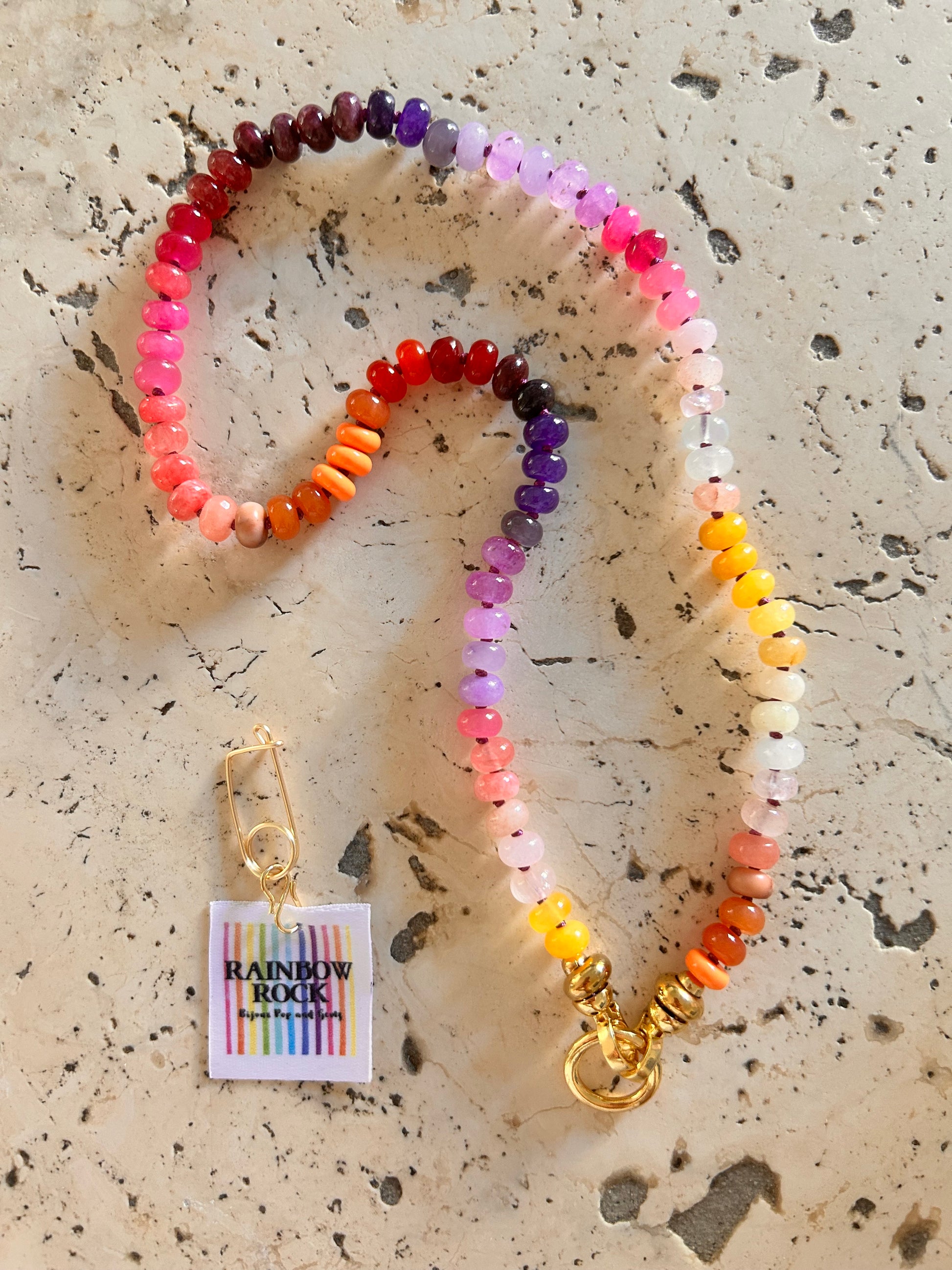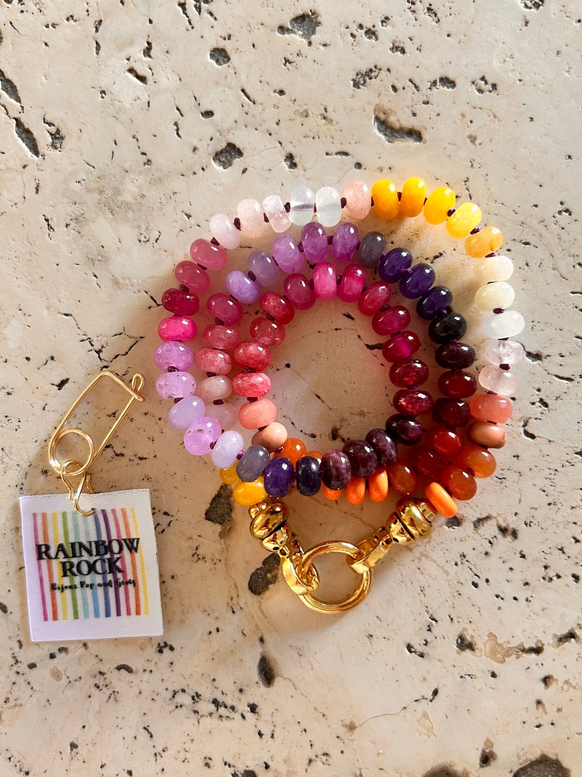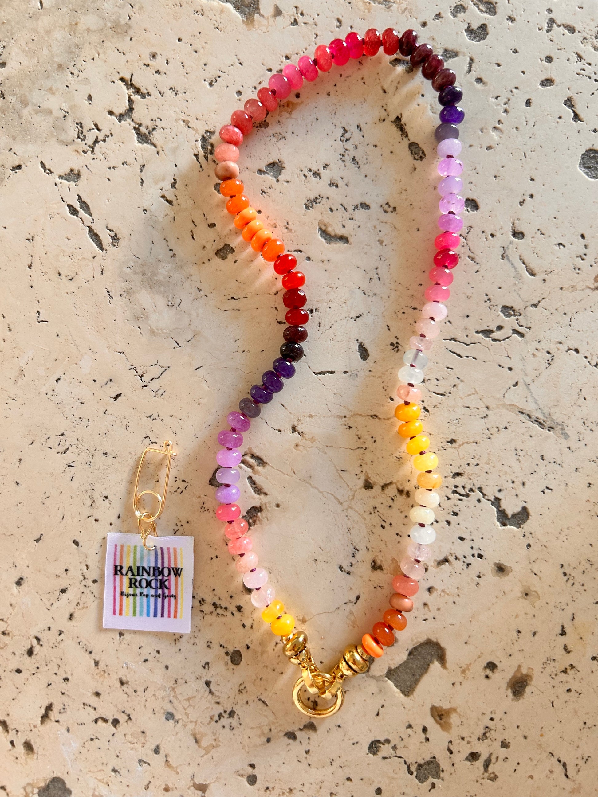 Un collier audacieux et lumineux, où les perles s’enchaînent comme les éclats d’un coucher de soleil festif. Du violet profond au rose bonbon, du jaune safran au corail fluo, chaque pierre semble infusée de lumière.