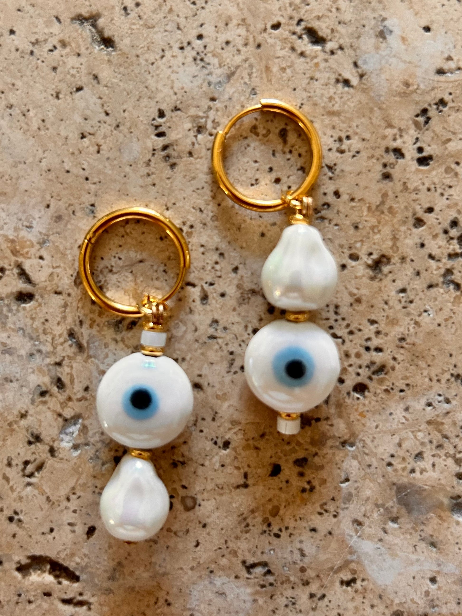 Les boucles Nazarina associent la puissance protectrice de la perle œil en céramique à la douceur lumineuse de la perle de culture. Un talisman moderne, à la fois symbole de protection et bijou raffiné. Leur créole dorée en acier inoxydable apporte la touche chic et intemporelle.