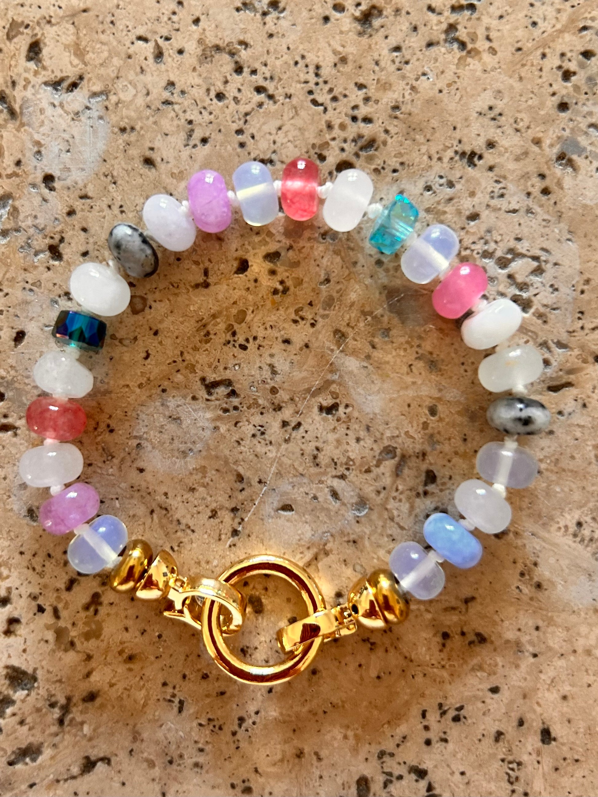 Un souffle de douceur marine et de poésie pastel 🌊🌸. Le bracelet Romy joue avec la lumière et les reflets, dans un camaïeu de nuances nacrées et colorées. Délicat, lumineux et plein de fraîcheur, il se porte seul ou en duo avec le collier assorti pour une harmonie parfaite.