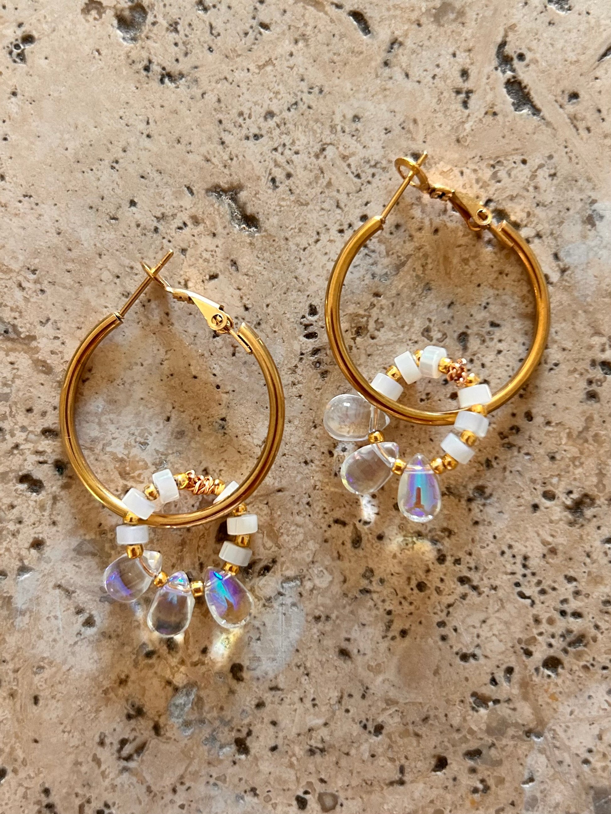 Les boucles Miralis capturent la lumière comme un éclat de lune posé au creux de vos oreilles. Leurs gouttes de verre aux reflets irisés et leurs perles de nacre douce se balancent délicatement sur une créole dorée, créant une aura scintillante et élégante. À porter avec ou sans pendentif, elles s’adaptent à vos envies, du minimalisme chic au raffinement lumineux. Miralis est une ode à la féminité subtile, à la fois aérienne et magnétique.